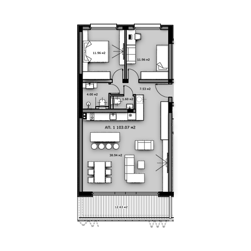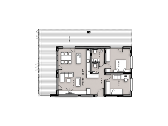 1 Хол с кухня • 2 Спални • 1 Баня • 1 Тоалетна • от 124.17 кв.м.