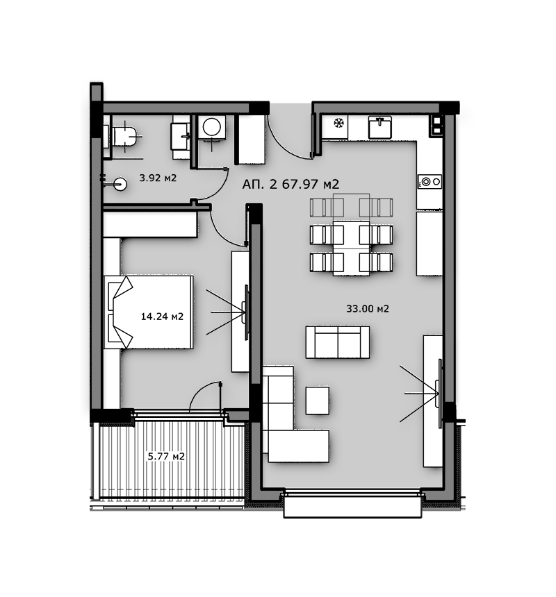 1 Хол с кухня • 1 Спалня • 1 Баня • от 83.21 кв.м.