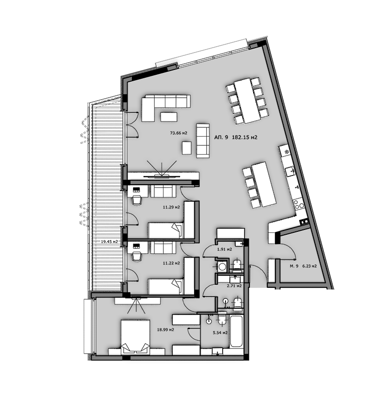 1 Хол с кухня • 3 Спални • 2 Бани • 1 Тоалетна • от 204.80 кв.м.