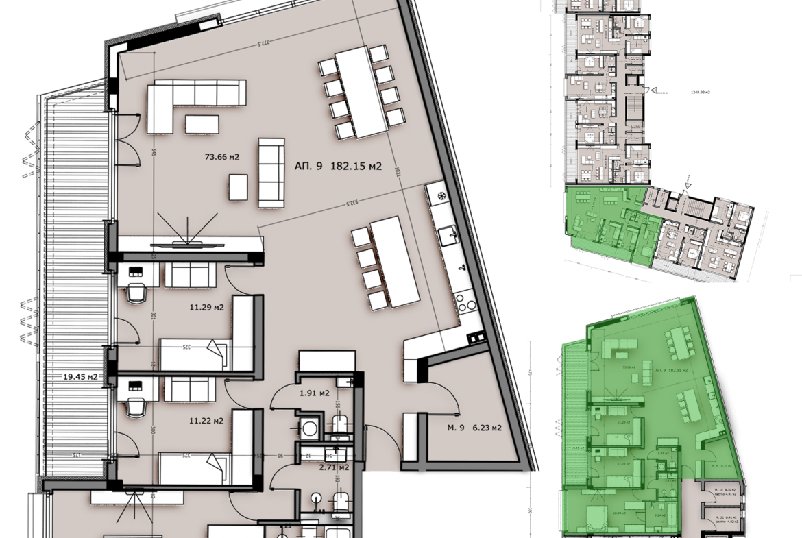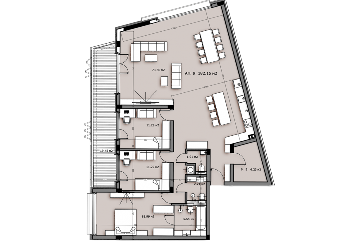 Разпределение: входно антре, хол с кухненси бокс – 73.66 кв.м. с прилежаваща тераса 19.45 кв.м., родителска спалня – 18.99 кв.м. с баня – 5.54 кв.м., две спални – по 11.22 кв.м. всяка, баня – 2.71 кв.м., отделна тоалетна за гости – 1.91 кв. м. Мазе – 6.23 кв.м. Изложение юг, югозапад, запад.
