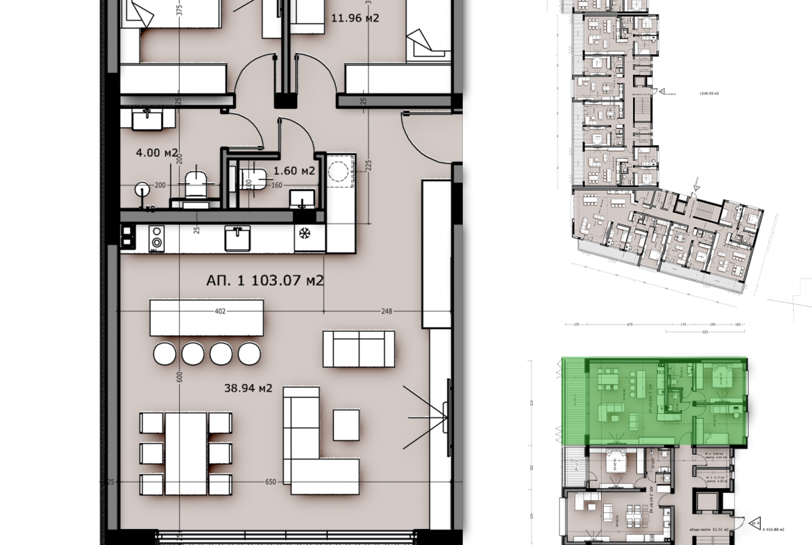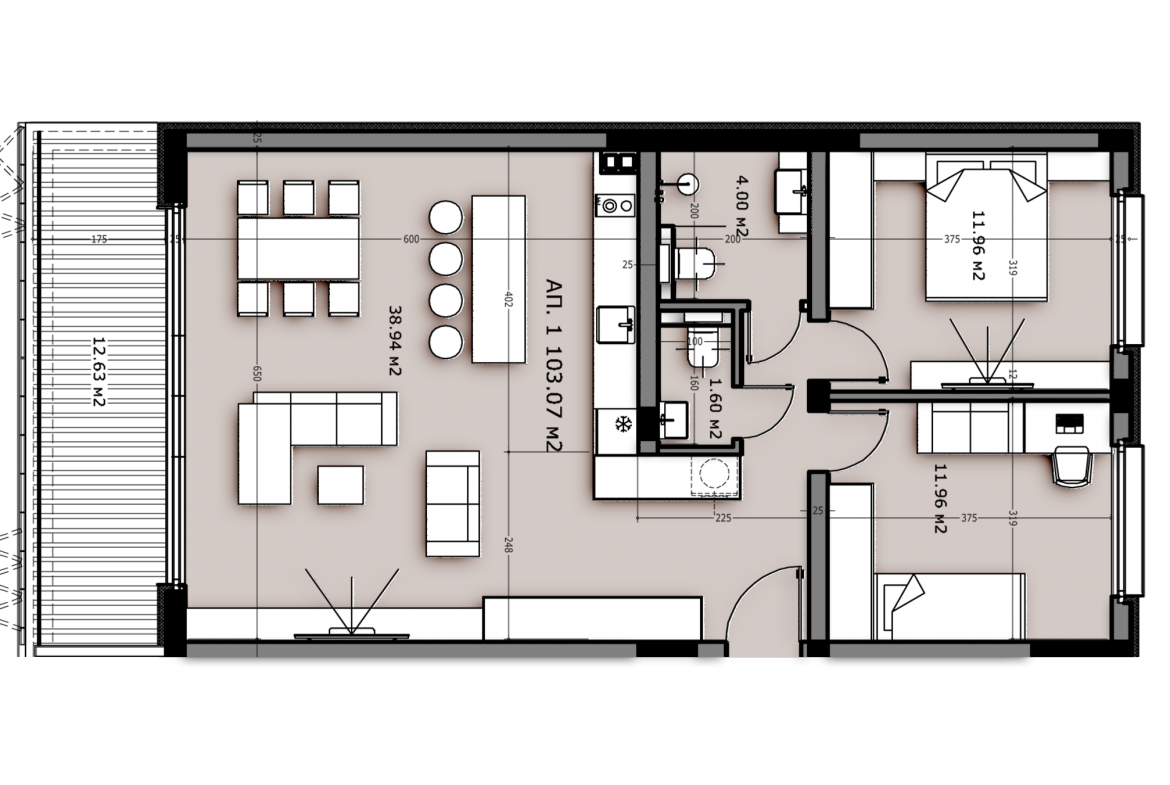 Разпределение: входно антре – 7.53 кв.м., хол с кухненси бокс – 38.94 кв.м. с прилежаваща тераса 12.63 кв.м., баня с тоалетна – 4 кв.м., отделна тоалетна за гости – 1.6 кв. м. и две спални – по 11.96 кв.м. всяка. Изложение спални – изток, хол с кухненски бокс – запад.