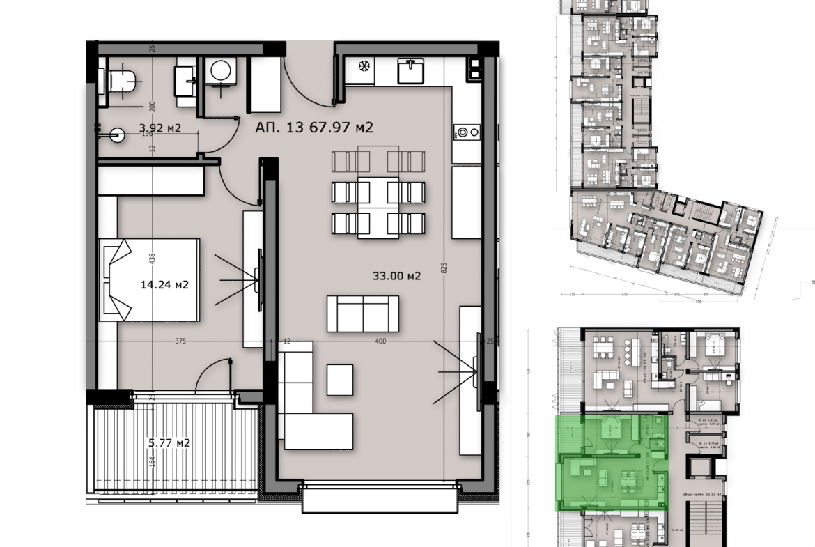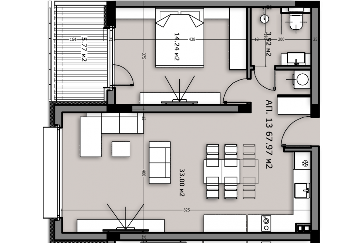 Разпределение: входно антре и хол с кухненси бокс – 33 кв.м. с прилежаваща тераса 5.77 кв.м., баня с тоалетна – 3.92 кв.м. и спалня -14.24 кв.м. Изложение запад.
