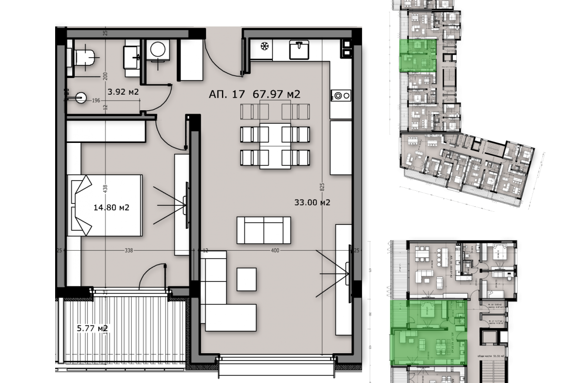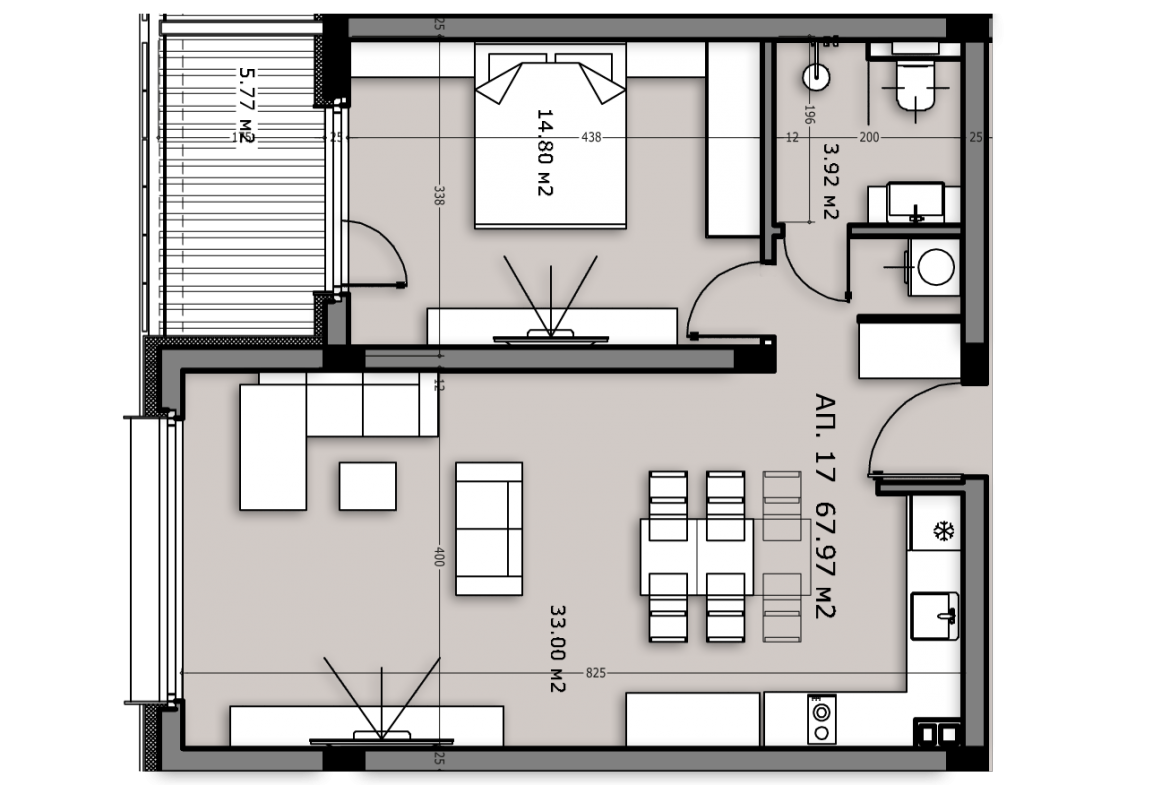 Разпределение: входно антре и хол с кухненси бокс – 33 кв.м. с прилежаваща тераса 5.77 кв.м., баня с тоалетна – 3.92 кв.м. и спалня -14.24 кв.м. Изложение запад.