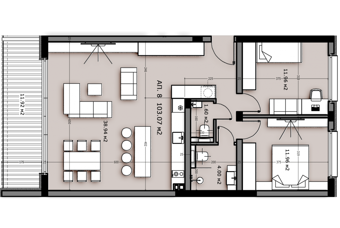 Разпределение: входно антре – 7.53 кв.м., хол с кухненси бокс – 38.94 кв.м. с прилежаваща тераса 11.92 кв.м., баня с тоалетна – 4 кв.м., отделна тоалетна за гости – 1.6 кв. м. и две спални – по 11.96 кв.м. всяка. Изложение сплни – изток, хол с кухненски бокс – запад.