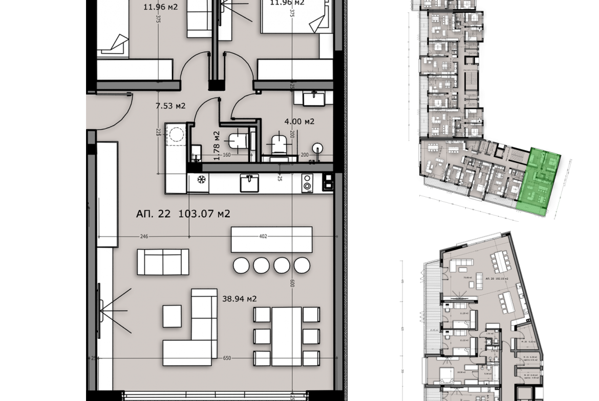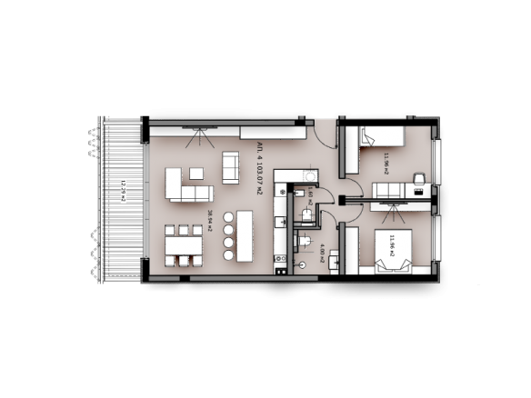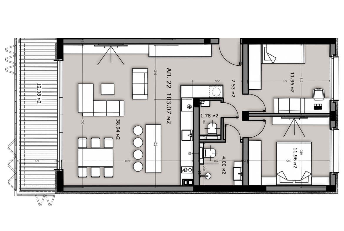 Разпределение: входно антре – 7.53 кв.м., хол с кухненси бокс – 38.94 кв.м. с прилежаваща тераса 12.08 кв.м., баня с тоалетна – 4 кв.м., отделна тоалетна за гости – 1.6 кв. м. и две спални – по 11.96 кв.м. всяка. Изложение хол с кухненски бокс – югозапад, юг, спални – изток и североизток.
