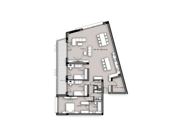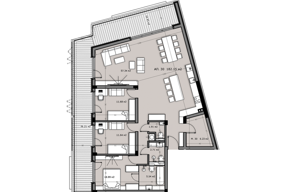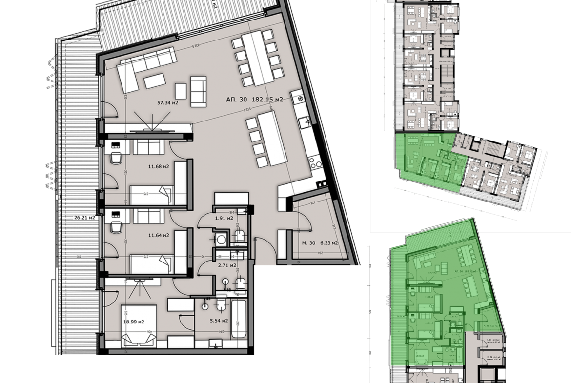 Разпределение: входно антре, хол с кухненси бокс – 57.34 кв.м. с две прилежаващи тераси 19.45 кв.м. и 26.21 кв.м., родителска спалня – 18.99 кв.м. с баня – 5.54 кв.м., две спални – по 11.22 кв.м. всяка, баня – 2.71 кв.м., отделна тоалетна за гости – 1.91 кв. м. Мазе – 6.23 кв.м. Изложение юг, югозапад, запад.