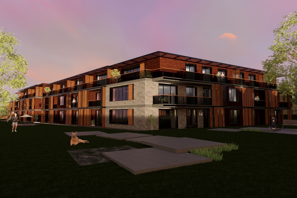 Сградата е проектирана с фасадни облицовки от високо ниво! Основният ефект идва от облицовка с керамични тела тип „тухла“, стъклени парапети от армирано стъкло и слънцезащитни вертикални фасадни елементи.